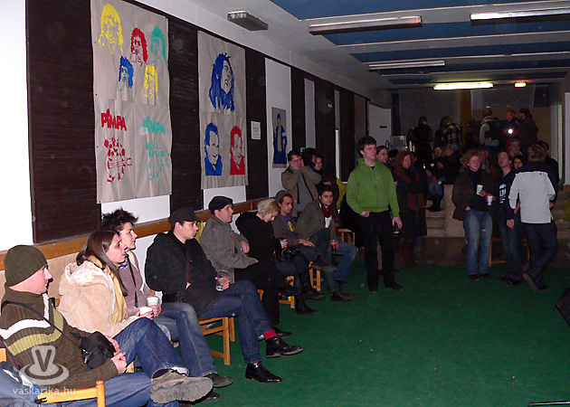 A bejáratnál érkezett az első pluszjel: az épület főbejárata helyett két ház közötti résen lett volna a bejutási zóna kezdőpontja - ha a szervezők ezt ötletes módon nem építették volna át -, ehelyett egy fekete fóliával befedett folyosón, a talajon, a fal mellett futó, egyszínű égősorral megvilágítva juthattunk be a történések helyszínére. Az L-alak túlsó végén két - kinézetre - tekintélyes méretekkel rendelkező jegyes-ember fogadja az érkezőket, a belépő szimbolikus, az ajtónállók a szimpatikus kaszthoz tartoznak. Zárt udvarra lépünk, mely hasonlatosan a bejárathoz, ismét pozitív benyomást gyakorol. 8x10 méter saccra, padokkal, az ismert hő-befúvós teraszmelegítőkkel, legfőképp egy hatalmas kivetítő-vászonnal, és nem utolsósorban gesztenye- illetve forraltbor árusító pulttal. Elsőre nem is rossz. A kihelyezett hamutartók számából a bennünk lakó Derrick (RIP) egyből kihámozta, hogy ez a rész a dohányosok menedéke is egyben.