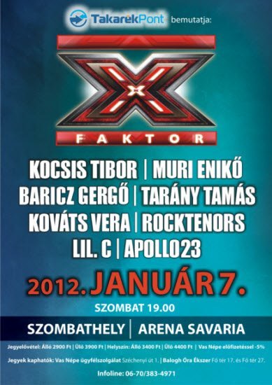 Január 7-én az X-Faktor második szériájának sztárjai, Kocsis Tibor, Muri Enikő, Baricz Gergő, Tarány Tamás, Kováts Vera, a Rocktenors, Lil. C és az Apollo 23 lépnek fel az Arena Savariában. A nyereményjátékunkra helyes választ beküldők között 3x2 darab belépőt sorsolunk ki! Január 7-én, 12 óráig várjuk olvasóink megfejtését!