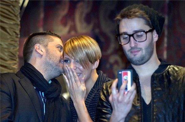 Kökény Attila, Bencsik Tamara és Király Viktor énekesek, a döntő résztvevői (b-j) a sajtótájékoztatón, a Művészetek Palotájában.