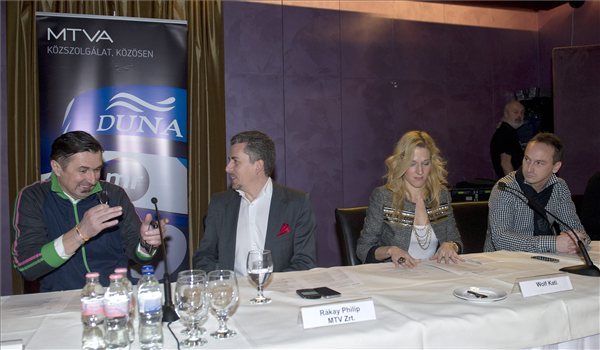 Csiszár Jenő rádiós és televíziós műsorvezető, Rákay Philip, az m1 és az m2 intendánsa, Wolf Kati énekes, a dalfesztivál tavalyi magyar indulója és Rakonczai Viktor zeneszerző (b-j), a zsűri tagjai a sajtótájékoztatón, a Művészetek Palotájában, ahol bemutatták azt a húsz dalt, amely közül a győztes képviseli májusban, Bakuban Magyarországot az Eurovíziós Dalfesztiválon