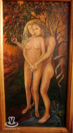 Kiemelnék egy képet, a Paradicsomi jelenetet. Ez a festményed az igazán újdonság nekem. Férfi és Nő intim közelsége-simulása első szabad pillanatát találtad el. A szemérem féltése, a test rejtése abban a pillanatban tűnik el, amit ábrázoltál: a gyengéd-gyámolító férfikéz érinti, oldja le a magát takaró női kezet. Ezzel, a kezek találkozásával illan a félelem és születik meg a bizalom. A mát a földre vetett farmernadrággal jelzed, míg a pár az édeni idill részese. Az érett gyümölcsöktől roskadozó ágak almáinak arany-narancs lámpácska-melegében találnak egymásra...