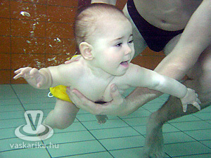 Az első alkalommal, kislányom inkább megfigyelőként viselkedett. Nem sírt akkor, sem amikor víz alá került a fejecskéje, inkább mindenről „csakúgy" tudomást vett. Aztán a második-harmadik alkalommal kezdtem megérteni az olvasottakat. Ahogy a vízben mozgott kislányom rendkívüli élményt nyújtott számomra is. Most már várjuk az alkalmakat, amikor mehetünk „úszni". 7 és fél hónaposan ott tartunk, hogy amikor meglátja a medencét, már akkor kacag, örül, és hihetetlen energia árad belőle. Amikor végre bemegyünk a vízbe, ott kiteljesedik az öröme, és teljesen magával ránt engem is. Szereti a vizet, tudja, hogy ott vagyok és érzem, bízik bennem. Hihetetlen harmónia van köztünk. Azt, hogy mennyire lesz befolyással a későbbi fejlődésére, még egyelőre nem tudom, de most teljes az örömünk, és ez mindenképp bíztató a jövőre nézve is- lelkesen meséli Kósi Anita anyuka.