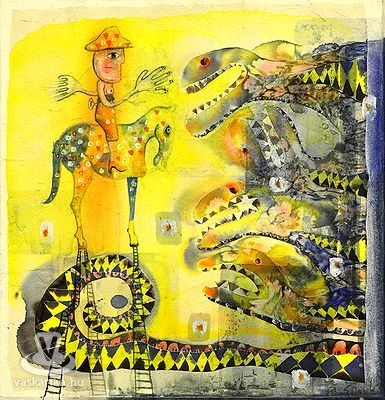 Zsu jóval közelebb hívta az érdeklődőket, már-már osztálynak hatottunk a teremben, ahol mindenki ismeri egymást. 3 csoportra osztott minket, mi voltunk a ritmus. Biztosította az megjelenteket, nagyon nehéz dolgunk lesz. Először „betanultuk" saját szólamunkat. Az első csoport a csettintőké, a második a „sísapka" szólam, míg a harmadik csoport a tapsolóké lett. Bevalljuk, életünkben nem voltunk még sísapka, de ott, a rajzok között csak egyetlen pillanatig hatott ez furcsának. S mivel egy mesében voltunk, ahol mindent szabad, és bármi megtörténhet, elragadott minket ez a világ. Aztán jöttek a próbálkozások, egyik szólam a másikkal, aztán hárman együtt, aztán ismét külön-külön. El nem tudtuk képzelni, ebből mi lesz, de ahol „létralába" lehet egy lónak, ahol meg lehet ülni egy „halat", teljesen természetes volt tapsolás és csettintés közepette sísapkának lenni. Aztán Zsu - a szólamok és Frank Sinatra hathatós segítségével - a holdra repített minket. Az „osztály" ott kiszállhatott, és fentről szemlélhette újra a mesevilág képeit a falon, ami lentről ugyanúgy máshogy hatott, mint fentről.