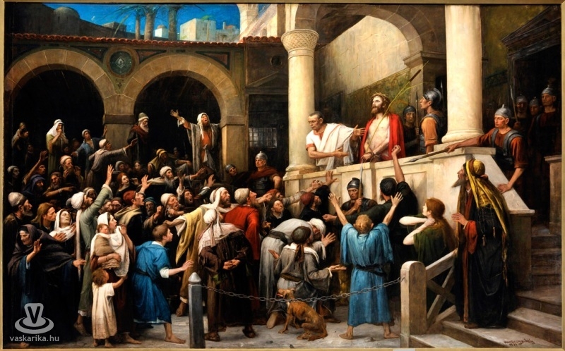 a Munkácsy - életmű legutolsó nagy alkotása. „Én azért születtem, és azért jöttem e világra, hogy bizonyosságot tegyek. Mindaz, aki igazságból való, hallgat az én szómra."- mondja Jézus a helytartónak. „Monda néki Pilátus: Micsoda igazság? (Jn. 18, 37b 38a); Király vagy - é hát, csakugyan?- kérdi Pilátus. Jézus: „Te mondod"- feleli Jézus. ... Az én országom nem e világból való - mondja, hogy Pilátus értse, nem az ő hatalmára tör. Kulcsmondatok ezek a kettejük rövid kapcsolatában. Jézus szavaiból, cselekedeteiből megérzi, hogy nem közönséges halandóval van dolga. Többször nekifut, hogy megmentse, hogy a vesszőztetés elég ítélet legyen a dühöngő nép számára, mert nem talált benne semmi bűnt. A „Feszítsd meg őt!" követelésével is szembeáll. Jézus azonban konok, hajthatatlan, elkötelezett. Pilátus a képen nem a trónján ül, hanem fent az oszlopok között áll a megkínzott, töviskoronás Jézus mellett. „Ecce homo! - Íme, az Ember!" - mutatja fel a csőcselékkel szemben. Talán, volt is egy majdnem pillanat, hogy a szavát is megértse. Ezt elvágta a tömeg zsarolása: „ha szabadon bocsátod, nem vagy a császár barátja." Pilátus már nem tudja megmenteni az Embert. Gyávasága erősebb. Mossa kezeit, de nem tudja lemosni a bűnt.
