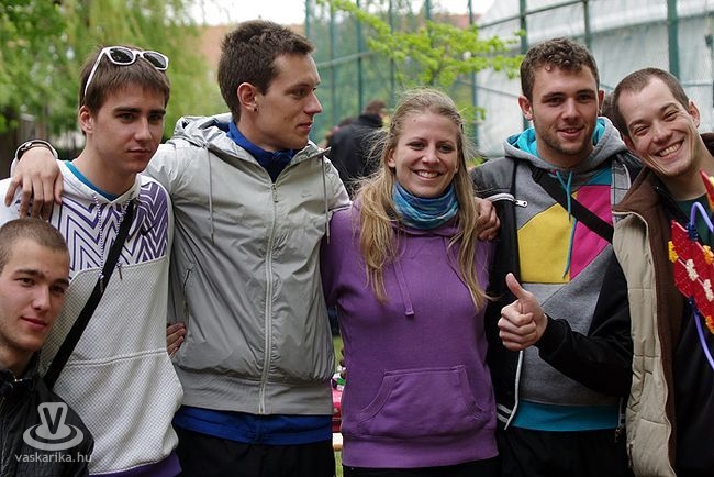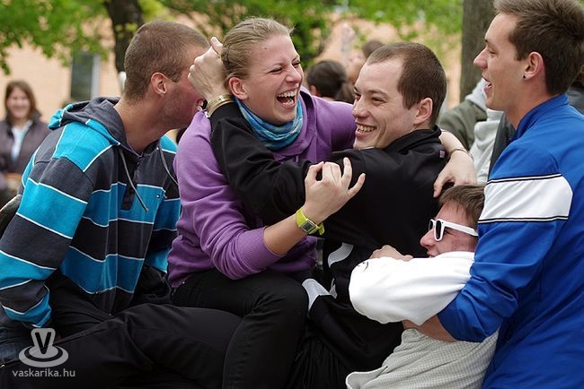 Hátravolt még egy valóban ügyességet és remek egyensúlyérzéket feltételező feladat, amiből persze nem maradhatott ki az alkalomhoz illő "részfeladat" sem. Gólyalábon kellett megtenni a kb. 20 méteres távot, majd az asztalról szájjal felemelni a Kunsági pálinkának álcázott, bélfacsaróval teli műapoharat, és felhúzni a "nedűt". Aztán visszagólyaláb a csapathoz, hogy ugyanezt tegye a következő (darab) emberke is. Azt kapásból leszűrtük, hogy a csajok sokkal jobban ráéreznek a gólyaláb technikájára, volt, aki oda-vissza le sem esett róla, ellenben a teremtés koronái (vagy rokonai, ha anagrammásítjuk, kis ékezethibával...) igencsak instabilan tolták a békafogó-lőcsöt. És nem a Kunsági lélekromboló miatt!