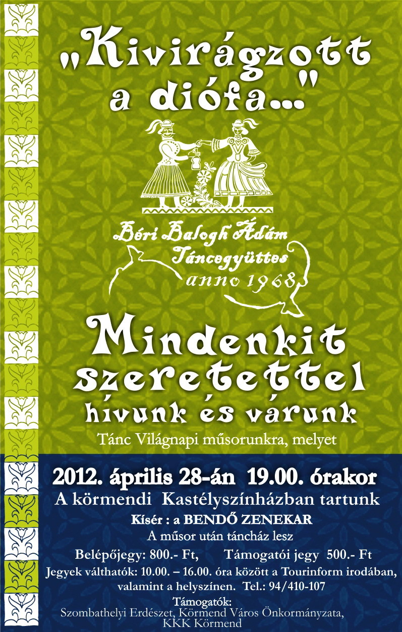 Április 28-án Körmenden, a Kastélyszínházban tartja Tánc Világnapi műsorát a Béri Balogh Ádám Táncegyüttes. A "Kivirágzott a diófa..." című, táncházzal egybekötött műsort a Bendő zenekar kíséri.