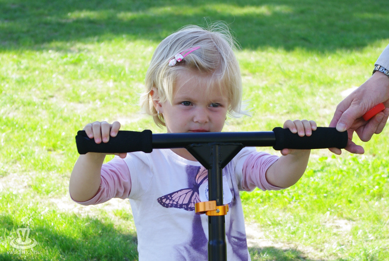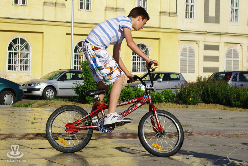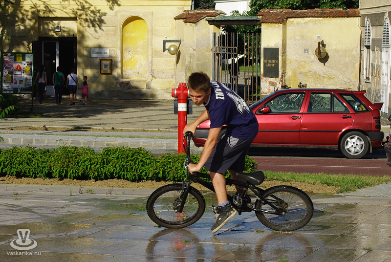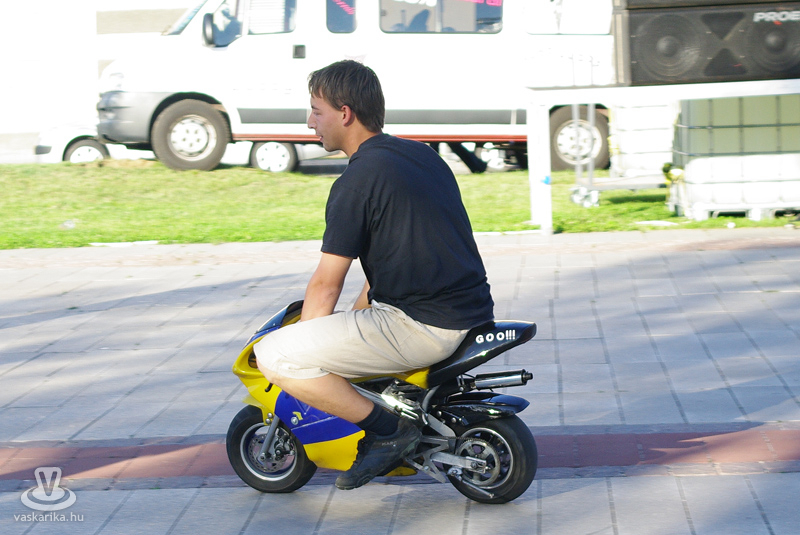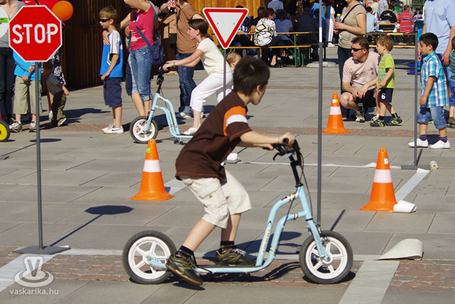 Közben a téren mindenki gurult, gördült jobbra-balra, a fantáziának úgy tűnt, nem szab határt semmi. Voltak kicsik nagy motorral, nagyok kis motorral, sőt, fiatal srácok egy csoportja - kihasználva a medencéből a térre engedett vizet - biciklijükkel nagyokat fékezve köröztek a feláztatott kövön. A legkisebbek birtokba vették a rollereket, és szinte ellepték a KRESZ pályát.