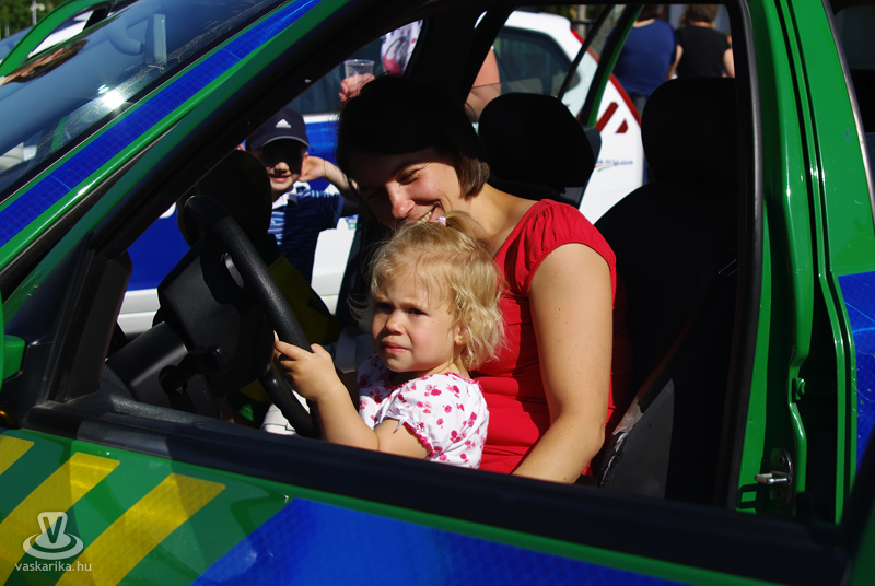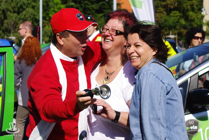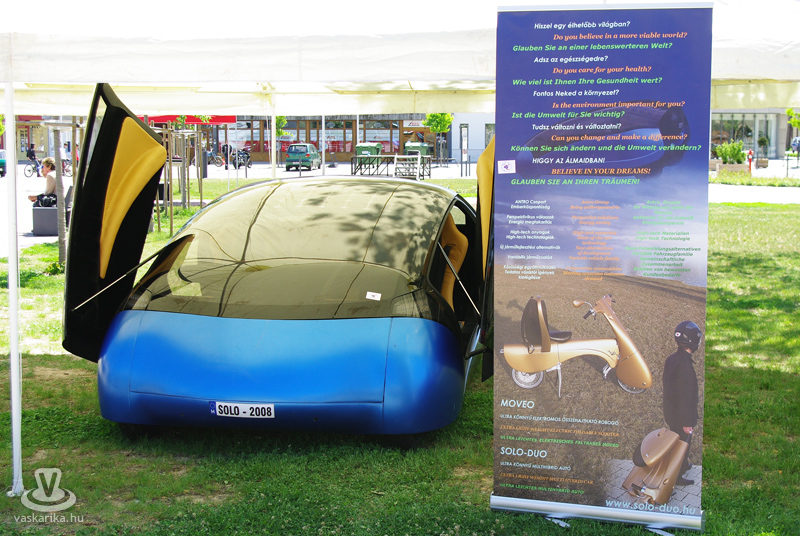 Talán a legtöbb érdeklődőt egy piros autócsoda vonzotta - természetesen szintén környezetbarát - aminek, ha kinyitották a motorháztetejét, azonnal kíváncsi férfihad vette körül. A szerencsésebbek mehettek is vele egy kisebb fordulót a város Fő terén.