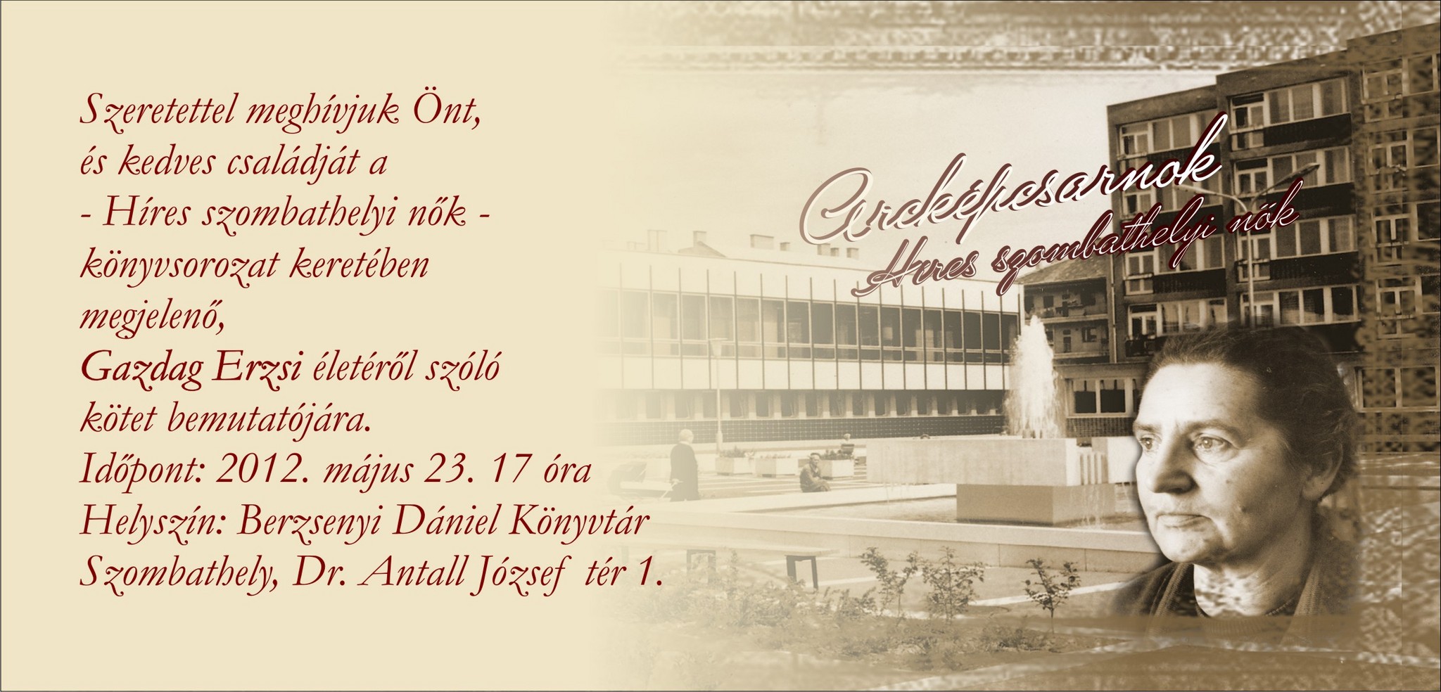 Az Arcképcsarnok sorozatban Gazdag Erzsi életéről szóló könyv bemutatójára kerül sor 2012. május 23-án 17 órakor, a Berzsenyi Dániel Könyvtárban.