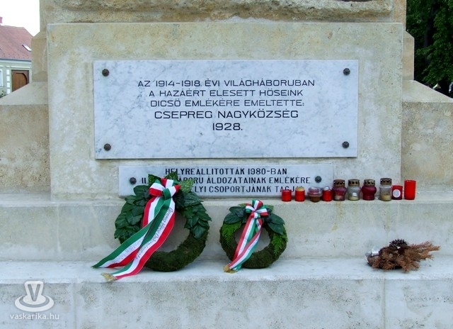 2012. május 27-én vasárnap délután Hősök-napi megemlékezést tartott Csepreg város lakossága az I. és II. világháborús emlékműnél. Ünnepi beszédet mondott: id. Dénes József, a Csepregi Honismereti Kör elnöke és Ziembicki Erzsébet, a művelődési ház vezetője, majd megkoszorúzták Király Árpád polgármester vezetésével az emlékműveket. Csepreg Város Fúvószenekara kísérte zenéjével az ünnepi ceremóniát.
