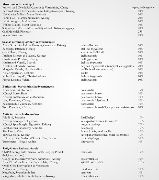 A kártya tulajdonosai kedvezményes Turista Parkoló bérletet válthatnak Kőszegen, illetve ingyenes információs csomagot vehetnek át a Tourinform irodában!