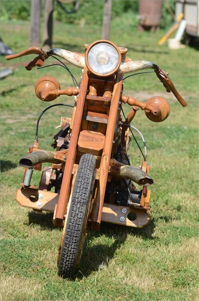 Múlt héten vonult le a Harley-Davidson találkozó, ám vizuális utórezgésként itt van egy gyöngyszem: Puskás István traktoros akácból épített motorkerékpárjával "repeszt" tiszaörsi háza előtt. A férfi két év alatt építette meg fa-chopperét, amelyet egy 126-os Polski Fiat motor gyorsít fel 25-30 kilométer/órás végsebességére. Az üzemanyagtankot hordóból, a kormányt és a kipufogót szürkemarhatülökből alakította ki, díszítésként pedig őzagancsot használt. A gumik és a motorblokk kivételével mindent ő készített.