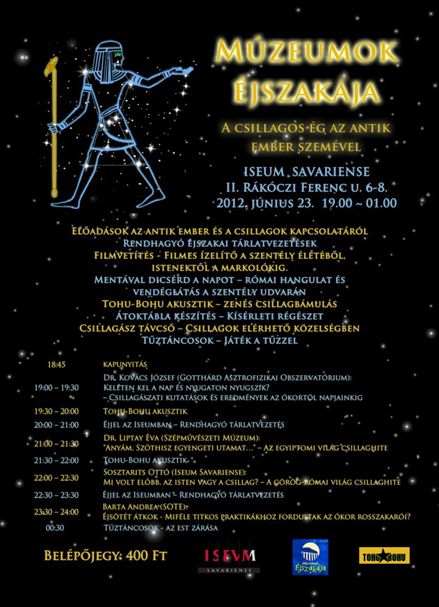 Izgalmas programokkal várja az érdeklődőket június 23-án este az Iseum Savariense. Előadások az antik ember és a csillagok kapcsolatáról és a rendhagyó éjszakai tárlatvezetések mellett lesz csillagbámulás távcsővel és kipróbálható lesz az átoktábla készítés is. Könnyed római hangulatú vendéglátás a szentély udvarán, amit a Tohu-Bohu zenekar akusztikus projektje és tűztáncosok előadása színesít majd.