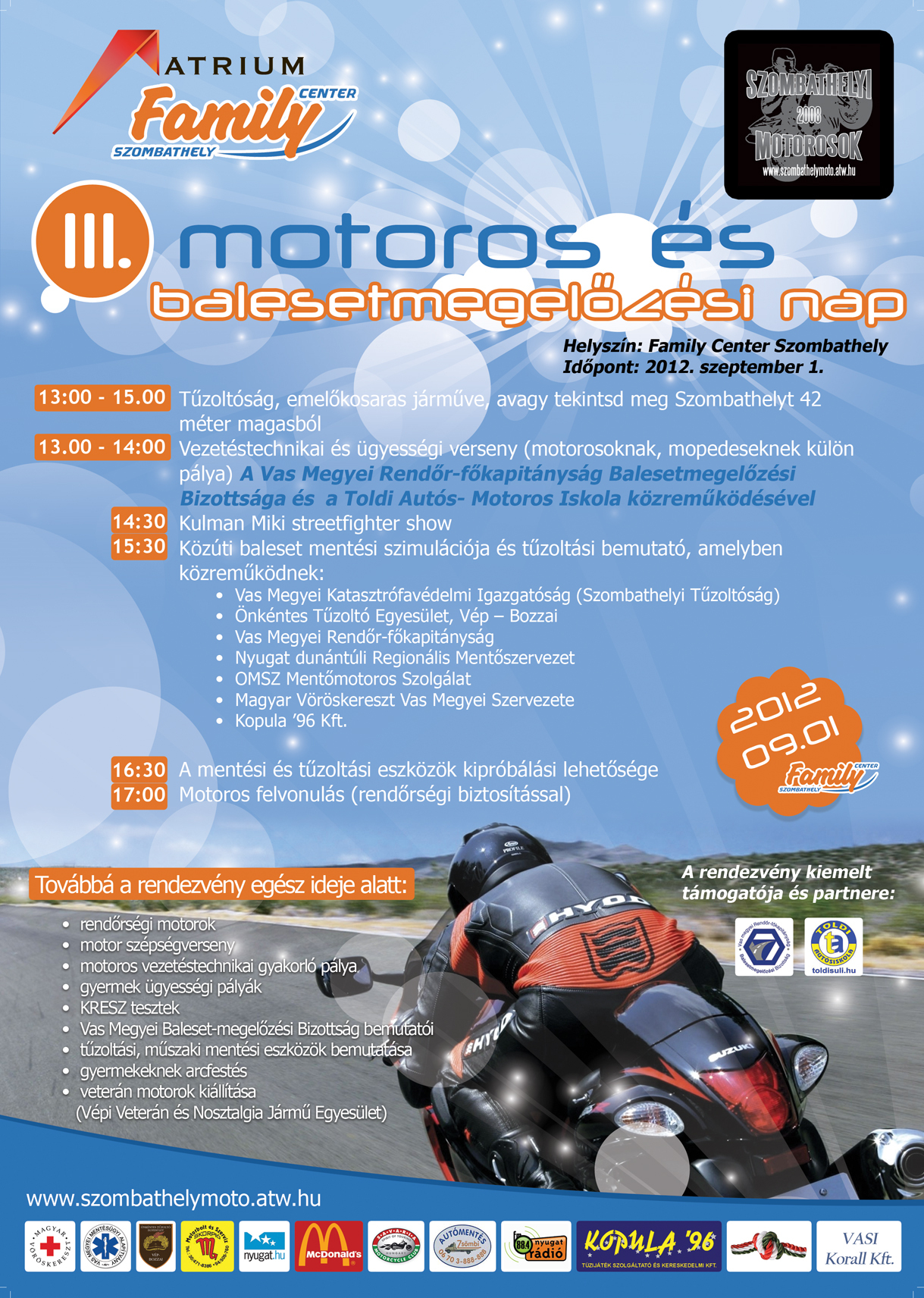 A balesetmegelőzési programokon túl (motoros vezetéstechnikai ügyességi pályák, tesztírás, prevenciós transzparensek, baleseti szimuláció) látványos show-elemekre számíthatnak a szombathelyi Family Center parkolójába érkezők: Kulman Miki streetfighter bemutatójára, rendőrségi motorok vezetéstechnikai bemutatójára.