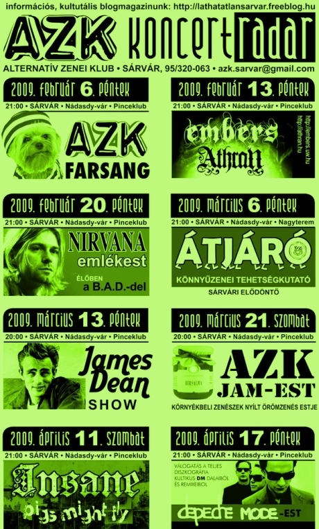 Metalcore zúzás az Embers és az Athran közreműködésével, Nirvana emlékest a B.A.D-del és James Dean Show szerepel a sárvári zenei élet központjában, az AZK-ban. A Nádasdy-vár további programjai közt megtalálható az irodalmi borkóstoló és az Átjáró 2. sárvári elődöntője.