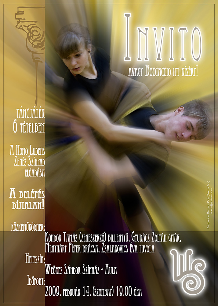 Invito, avagy Boccaccio itt kísért! címmel táncjátékot mutat be február 14-én 19 órától a Homo Ludens Zenés Színpad. Az előadás helyszíne a Weöres Sándor Színház aulája, a belépés díjtalan!