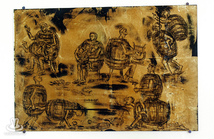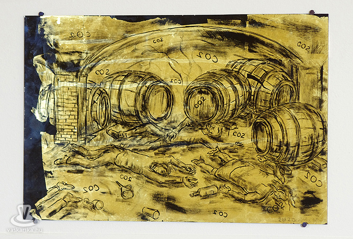 - Az egyik sorozat 24 karátos aranylemezekre karcolt ábrákból áll, a másik zöldséges rekeszekre készült - kezdi mindjárt a végén a művek bemutatását Böröcz András egy hordóra helyezett és különleges módon feldíszített fa előtt állva a pincészet palackozójában. A fa olyan, mint egy karácsonyfa, 30 kishordó és 20 pakli magyar kártya függ az ágain.