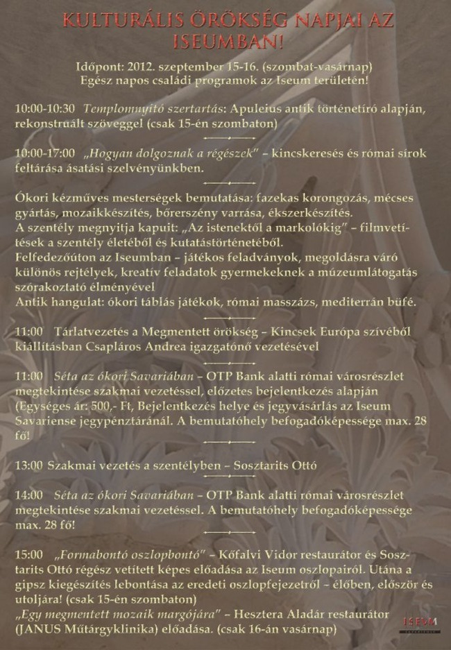 Kulturális Örökség Napjai az Iseumban (szept. 15-16.)