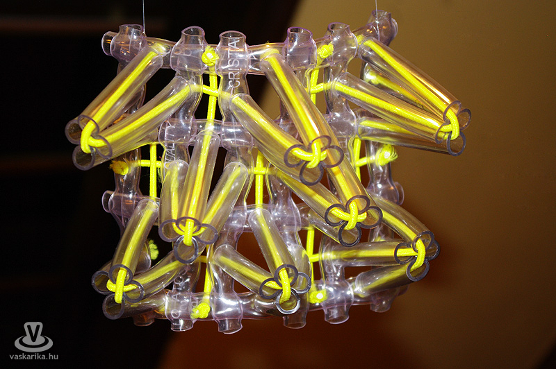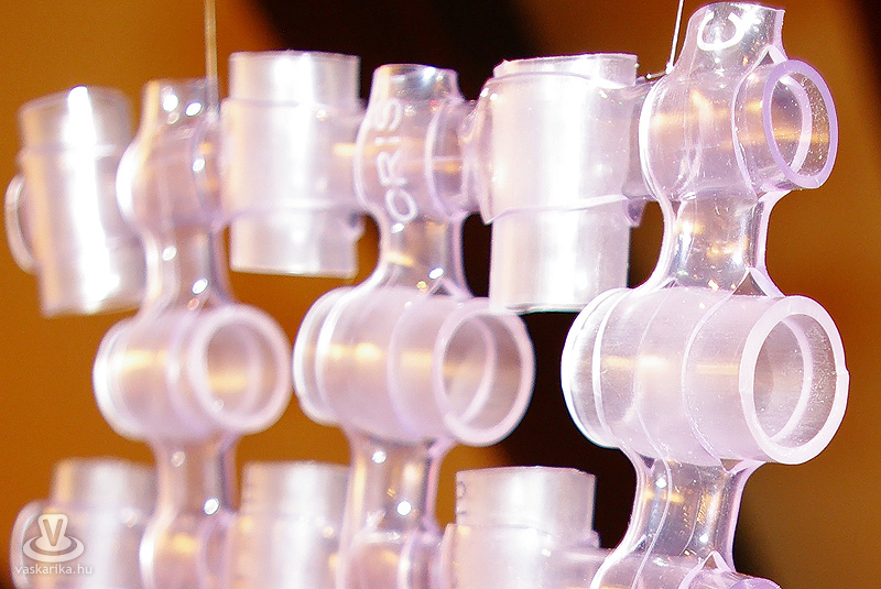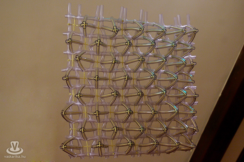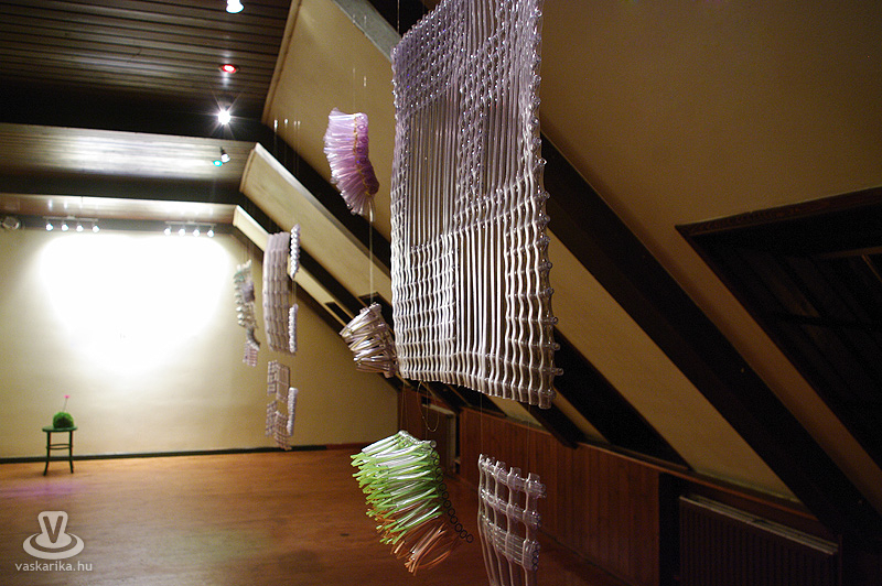 Amikor kiállításra érkezünk - hiába a művészet kiapadhatatlan tárháza - elsősorban képeket várunk a falon. Keretben. Ami a lépcsőforduló tetején a szemünk elé tárul, nos, azok a munkák nem a falra szegezve állnak előttünk fixen, sőt, még keretük sincs. Mindennapjaink gumicsöveiből készült, általunk csak „csőcsodáknak" hívott munkák lógnak alá, himbálóznak a tetőtérben.