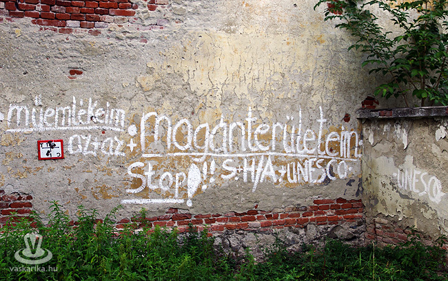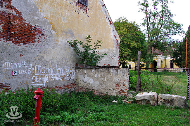 Fél évvel ezelőtt megírtuk már, hogy tíz éve olasz tulajdonosa van a műemlék épületnek, ám nagy parkja, és maga a kastély is elég siralmas képet mutat belülről. Azóta a helyzet annyit változott, hogy az épület még siralmasabb, a bejárati kaput övező épület oldalfalára viszont kikerült egy "elrettentő" és cinikusan egomán, festékszórt felirat, olyan hívószavakkal, mint "műemlékeim", "magánterületeim", "UNESCO"... Kérdés, hogy a felirat a tulaj "hatékony" területvédelmi akciója, vagy csak fricska a környék lakóitól. Mindenesetre jól példázza a kompetens hatósági szerv értékőrző, értékóvó hozzáállását, figyelmét, szakmai súlyát. Viszont legalább lett kapu és a kastélyépületre lakat került...