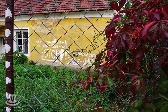 Újabb látogatásunk során meglepő, egyben elkeserítő változásba futottunk bele. Egyfajta megállítótáblaként fújták fel a bejárati kapu melletti falfelületre az alábbi szöveget: