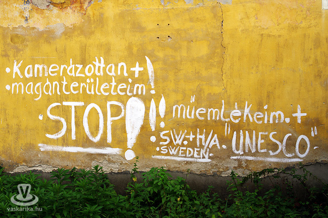 A lakat nélküli kapubejáraton belül mindjárt az első - műemlék - épületen is nyomatékosították, hogy bizony, ez itt kérem műemlék, magánterület és kamerázva van minden, az utolsó fűszálig (gyomig). Hogy a "Sweden"-nek mennyire visszafordító ereje van, azt nem tudjuk, viszont az UNESCO célja konkrétan az, hogy "megteremtse a civilizációk, kultúrák és emberek közötti, a közös értékek iránti tiszteleten alapuló párbeszédhez szükséges körülményeket."