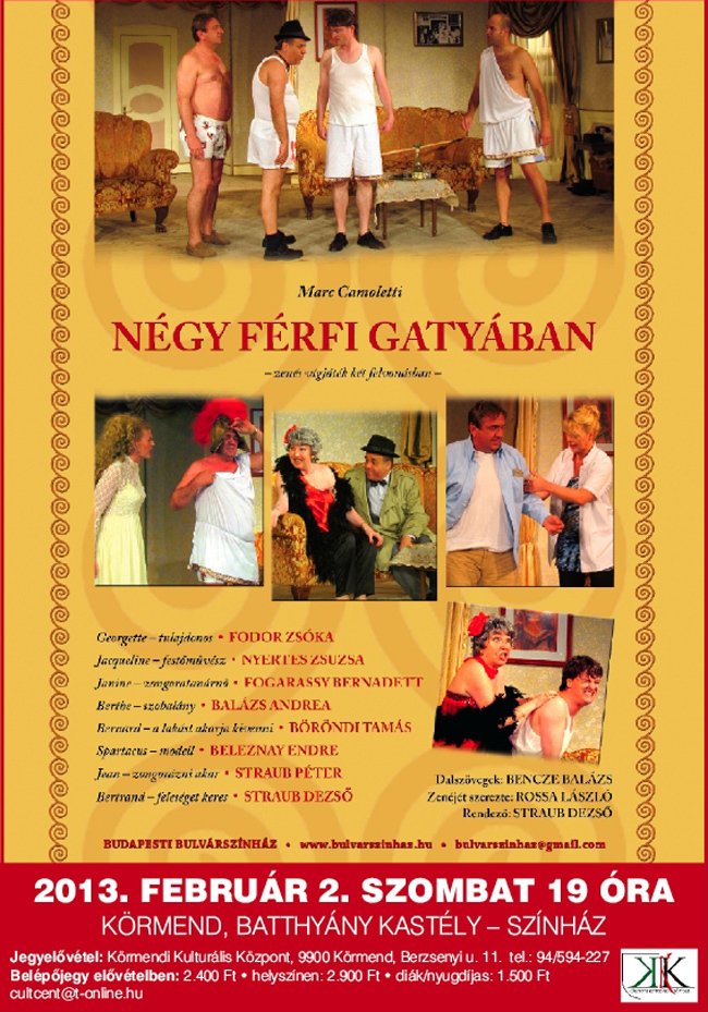 A fővárosi Fogi Színház - B. Bulvárszínház előadásában, február 2-án este Körmenden, a Batthány-kastélyban láthatják az érdeklődők Marc Camoletti zenés vígjátékát Négy férfi gatyában címmel.