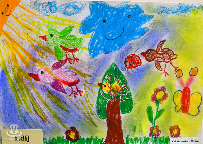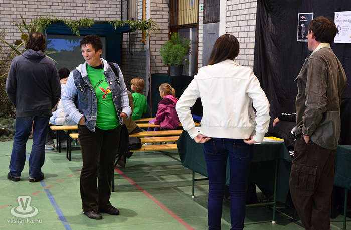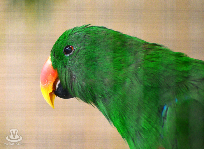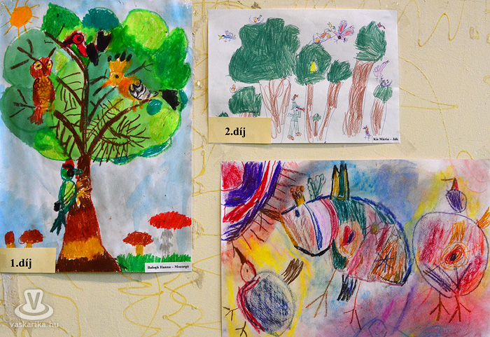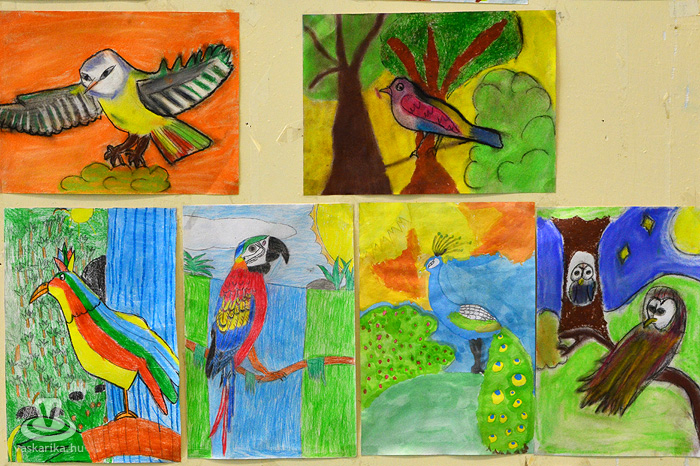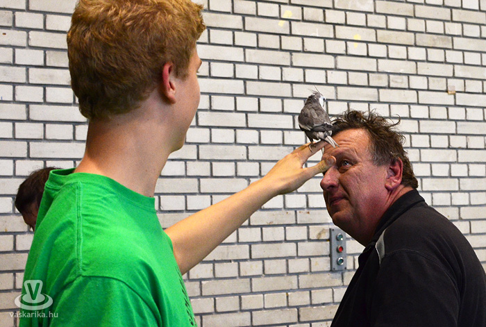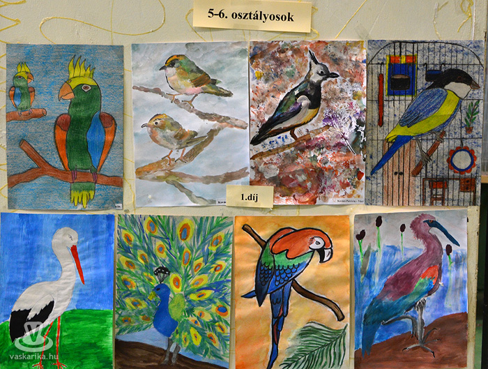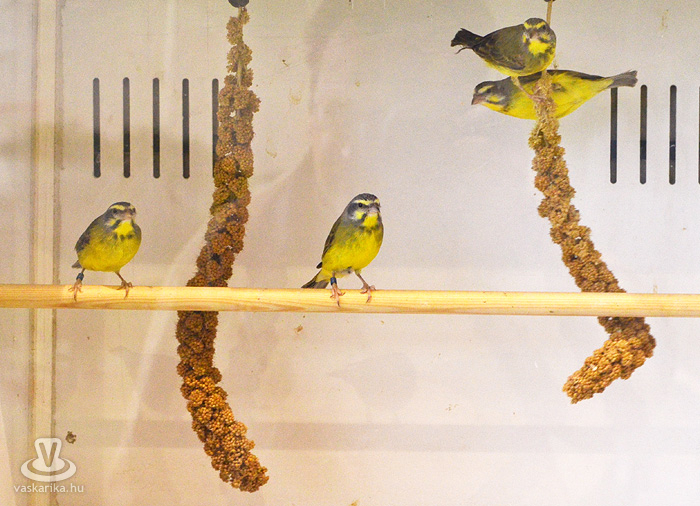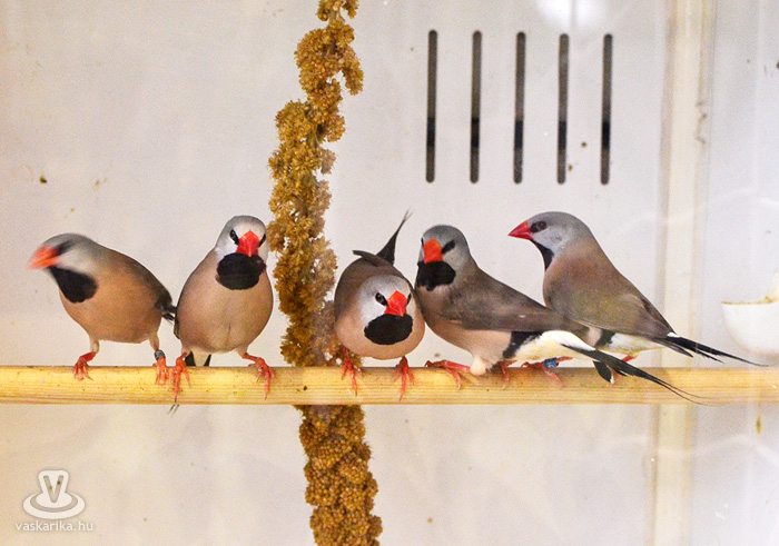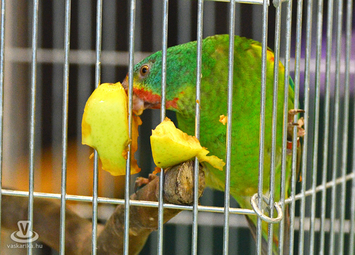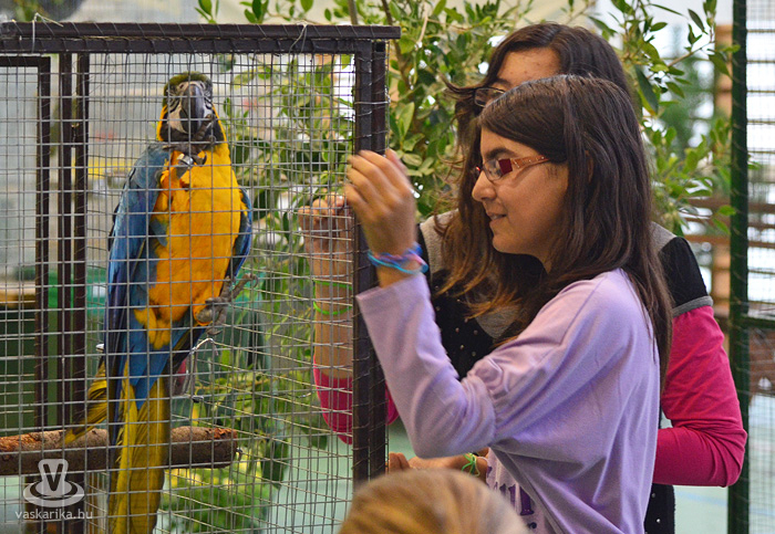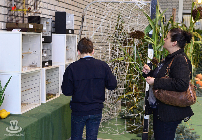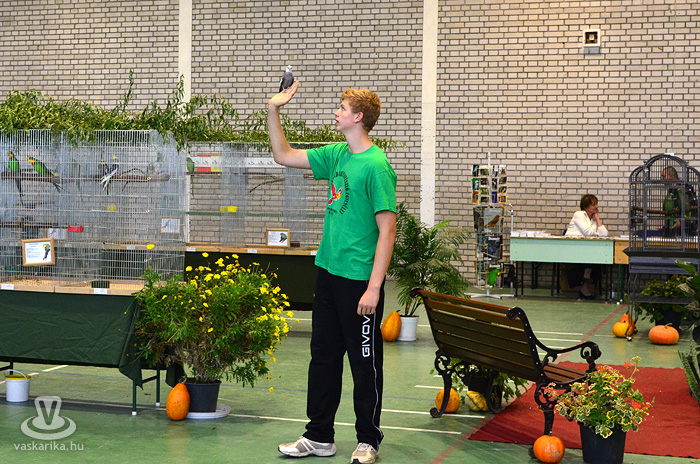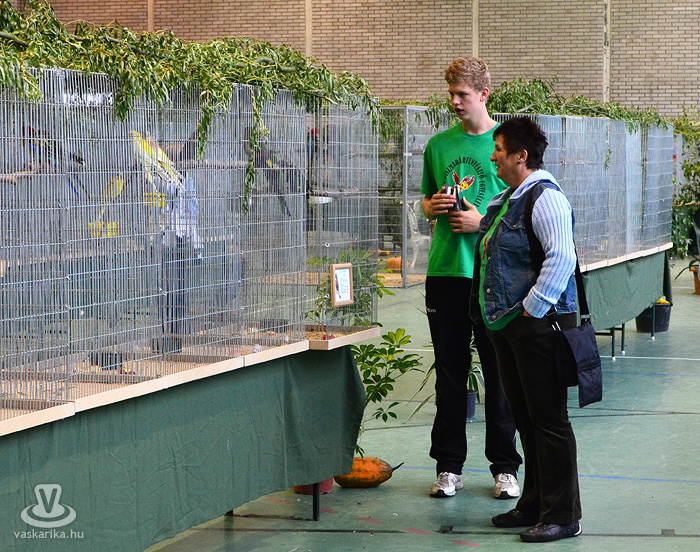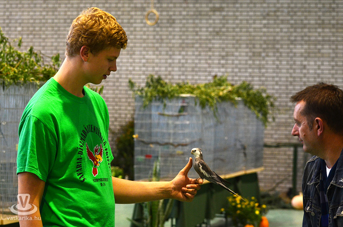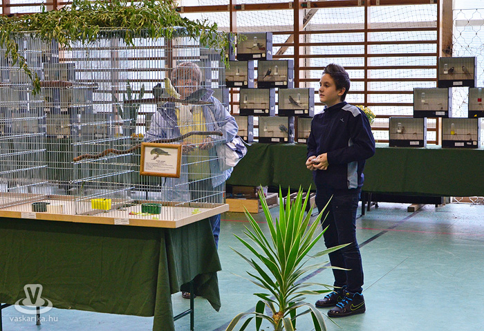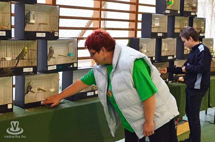 Az egyesület tenyésztői legszebb madaraikat hozták el a hétvégi kiállításra. Kanárik, pintyek, (zebrapinty, tűzpinty, sirálykapinty stb.), gyémántgerle, mozambiki csicsőrke, amandinák, és papagájfajták sokasága csicsereg, rikoltozik a Savaria Ifjúsági Centrum tornatermében. Szajkó, szarka is felbukkan a csarnok sarkában, közvetlenül a nyuszikifutó mellett. Élmény végigsétálni a sok madár közt, mintha egy dzsungelbe kerülne a látogató. A madarak vegyes vérmérsékletűek, némelyek nyugodtan ülnek a ketrecben, mások fel-alá rohangálnak, repkednek, egyesek pedig barátkoznak. A nagyobb testű papagájok közül egyeseknek annyira erős a csőrük, hogy erőfeszítés nélkül roppantják szét még a legkeményebb barackmagot is.