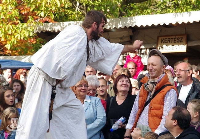 Akit nem hajtott a programok utáni vágy, az akár egy óra alatt meg is tehette a "felutat", elbámészkodva az időt a vásári kínálatban. Nem is szólva arról, hogy a kóstolás - legyen szó gesztenyéről, vagy forralt borról - igényli a portékára szánt figyelmet, nemcsak kutyafuttában átpörgetni az "italkapun" a forralt bort, pálinkát vagy épp a frissen csapolt meggysört. Nem is beszélve az utána kialakuló diskurzusról, ami nagyeséllyel "szakmailag összevető", a mondjuk tíz pavilonnal lejjebb tesztelt itókával. És bizony, nem tíz-húsz pavilon szegélyezte az Alkotóházig, és kicsit azon is túl vezető utat... A programokra érzékeny látogató viszont szlalom-képességeiről tehetett vizsgát: igazi kihívás volt az embermasszán "rést találni", s olykor élével pozíciót fogni a továbbhaladáshoz.