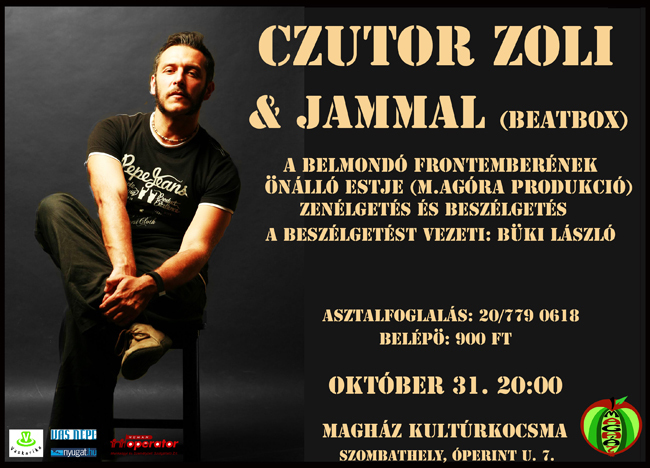 Czutor Zoli napjaink talán legsokoldalúbb zenésze, remek dalszerző, a tavalyi év legjobb szövegírója, érdekvédő zenész és nem utolsósorban remek beszélgetőtárs. Ezt tapasztalhatják meg mindazok, akik október 31 szerdán este 8 órától ellátogatnak a M-AGORA legújabb programjára. A beszélgetőtárs most is szelíd és provokatív kérdéseivel Büki László lesz. Szó lesz a slágerekről, azok születéséről, a Nyersről és a Belmondóról, egy picit a celebségről, s mindarról ami a helyszíni közönséget érdekli. A beszélgetést a kedvenc dalok kísérik, (figyelem, nemcsak sajátok) és itt lesz a legfrissebb zenésztárs Jammal, aki a beatbox elismert hazai zászlóvivője. Tehát, ha szerda: irány a Magház!
