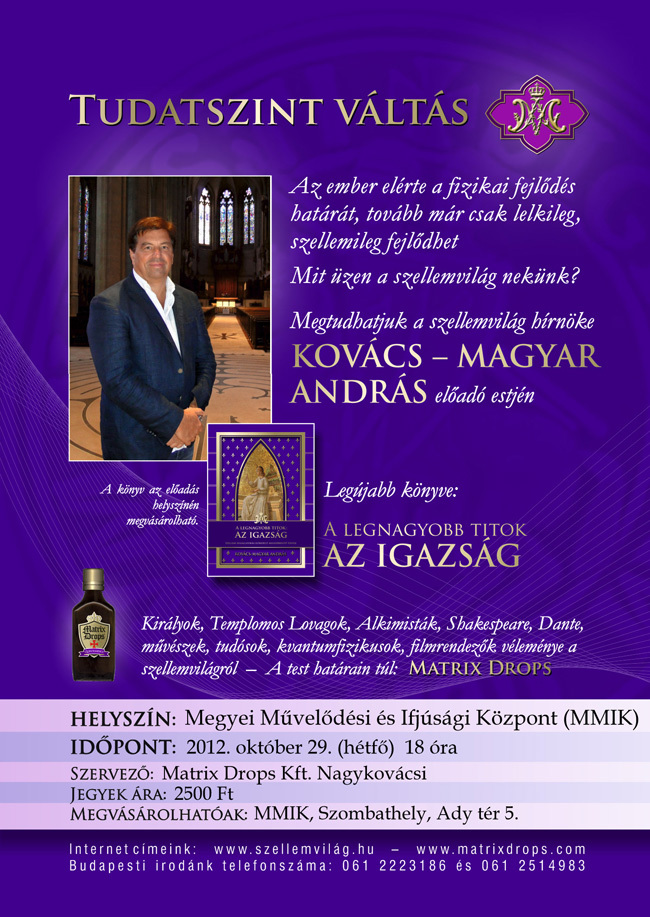 Kovács – Magyar András a szellemvilág hírnöke nemzetközi előadássorozatának egyik állomására, Szombathelyre érkezik. Előadásának címe: Tudatszintváltás. Új könyvével, „A legnagyobb titok az igazság” című titkokat feltáró kötettel ismerkedhetünk október 29-én, az MMIK-ban.