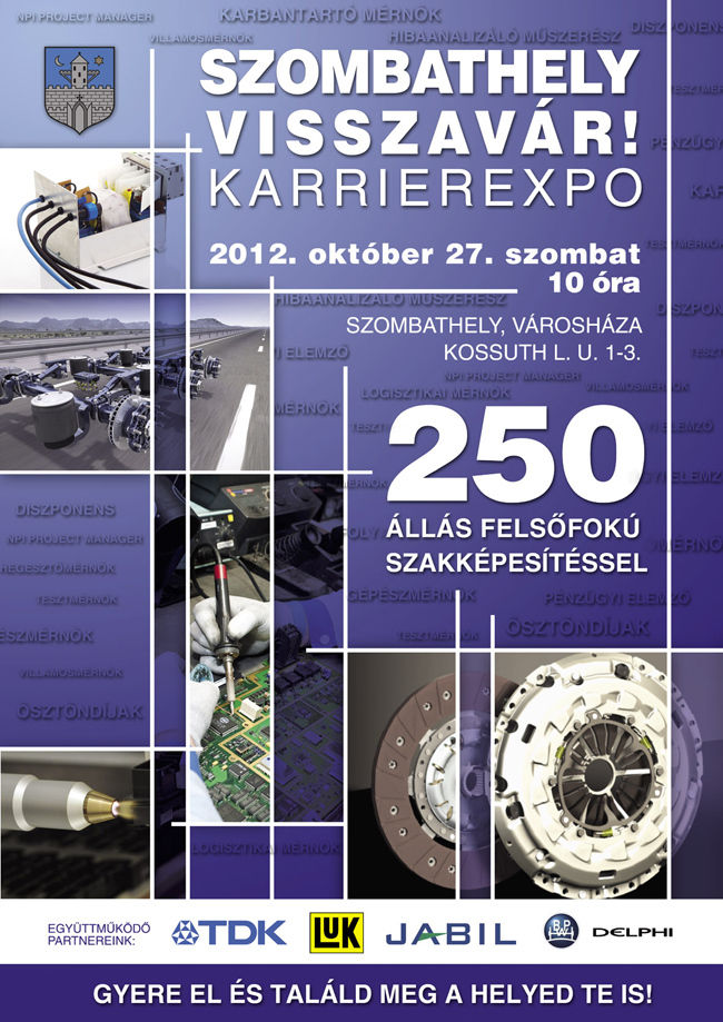 Szombathely város vezetése és az öt legnagyobb vállalat, a BPW, a Delphi, az EPCOS, a JABIL és az LuK folyamatosan együttműködik annak érdekében, hogy minél több új munkahely jöhessen létre a régióban. Ezen vállalatok a következő években közel 2.500 főt kívánnak alkalmazni. A bővítés részeként nagy számban lesz szükség mérnökökre, műszaki felsőoktatásban végzett szakemberekre. A közös programok folytatásaként ismételten megszervezésre kerül a „Szombathely visszavár!" szakmai fórum, ahol a cégek képviselői tájékoztatják a hallgatókat az elhelyezkedési lehetőségekről. A rendezvényre 2012. október 27-én 10 órakor a Polgármesteri Hivatal nagytermében kerül sor. Szeretettel várjuk mindazokat, akik élni szeretnének a lehetőséggel, hogy a régió gazdasági fellendülésének és gyarapodásának részesei lehessenek.