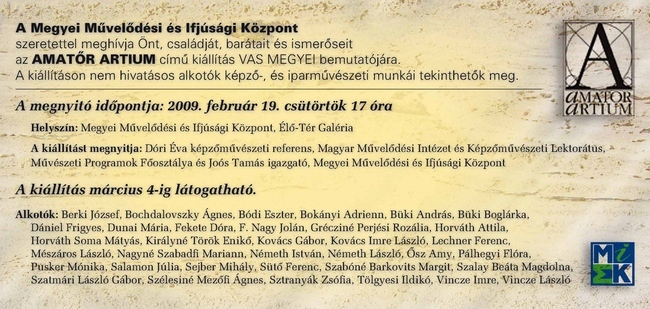 A Megyei Művelődési és Ifjúsági Központ szeretettel meghívja Önt, családját, barátait és ismerőseit a február 19-i AMATŐR ARTIUM című kiállítás VAS MEGYEI bemutatójára. A kiállításon nem hivatásos alkotók képző-, és iparművészeti munkái tekinthetők meg.