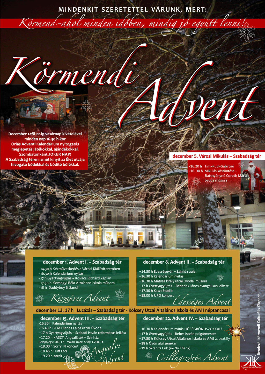 Körmenden december 1-től december 22-ig vasárnap kivételével minden nap fél ötkor Óriás Adventi Kalendárium nyitogatás várja meglepetés ajándékokkal a gyerekeket. A Szabadság téren ismét kinyit az Élet utcája, hívogató bódékkal és bódító bólékkal. A városi óvodások és iskolások, valamint a KASZT műsorai, és koncertek színesítik az adventi programokat.