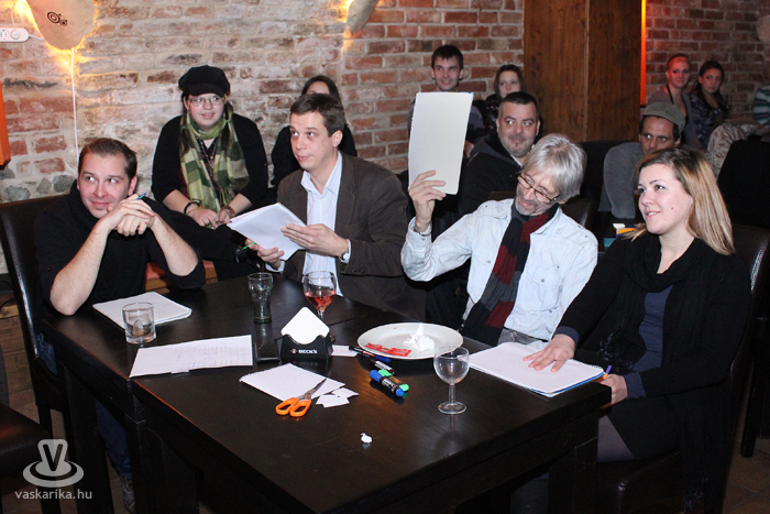 Zsűri bírálta el a szöveggyárosok fellépését: Devecsery László író-költő, Merklin Ferenc középiskolai és egyetemi tanár, Modor Réka egyetemi hallgató, és „Naszi", Aldo slam körökből merített ismerőse. Az Open-micet követően indult a verseny, ismét kifulladásig.