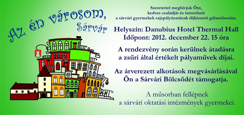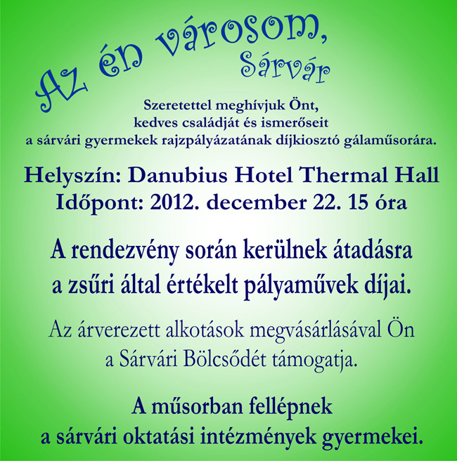 A Szülőföld Könyvkiadó szeretettel vár minden érdeklődőt december 22-én 15 órára a sárvári Danubius Hotelbe, ahol Az én városom Sárvár című gyerekkönyv bemutatója lesz. A könyvben sárvári gyerekek fogalmazták meg, miért szeretik sárvárt. Le is rajzolták, mi az, ami fontos, ami kedves nekik városukban, ezekből a pályamunkákból a zsűrízett alkotások árverezésre kerülnek a gálaműsorban, amelynek teljes bevételét a Sárvári Bölcsőde kapja. A délutánon fellépnek a sárvári oktatási intézmények gyermekei.