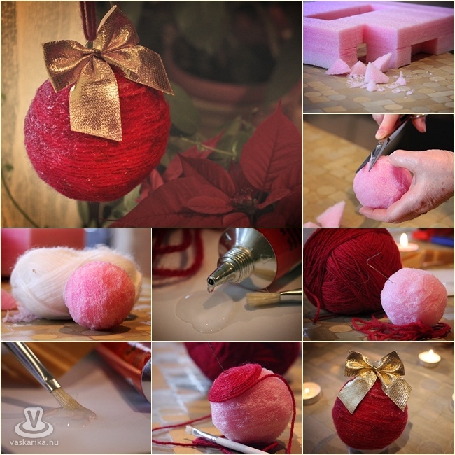 Fogj egy darab hungarocellt, és farigcsáld gömb formájúra. De bármelyik hobbyboltban beszerezheted, ha se időd, se kedved a szobrászathoz. Szúrd a drótot a gömbbe, ennél fogva tudod majd forgatni, a későbbiekben. A dróttól számított nagyjából 2 centinyi szakaszt kend be ragasztóval, majd kezdd el spirálisan feltekerni rá a fonalat. Így haladj egyre lefelé. A szakaszosság fontos, mert így nem szárad meg a ragasztó a fonallal való érintkezése előtt. Végül a drót elhajlításával kis akasztót képezhetsz, amire a masnit teheted, és a gömböt a fára akaszthatod.