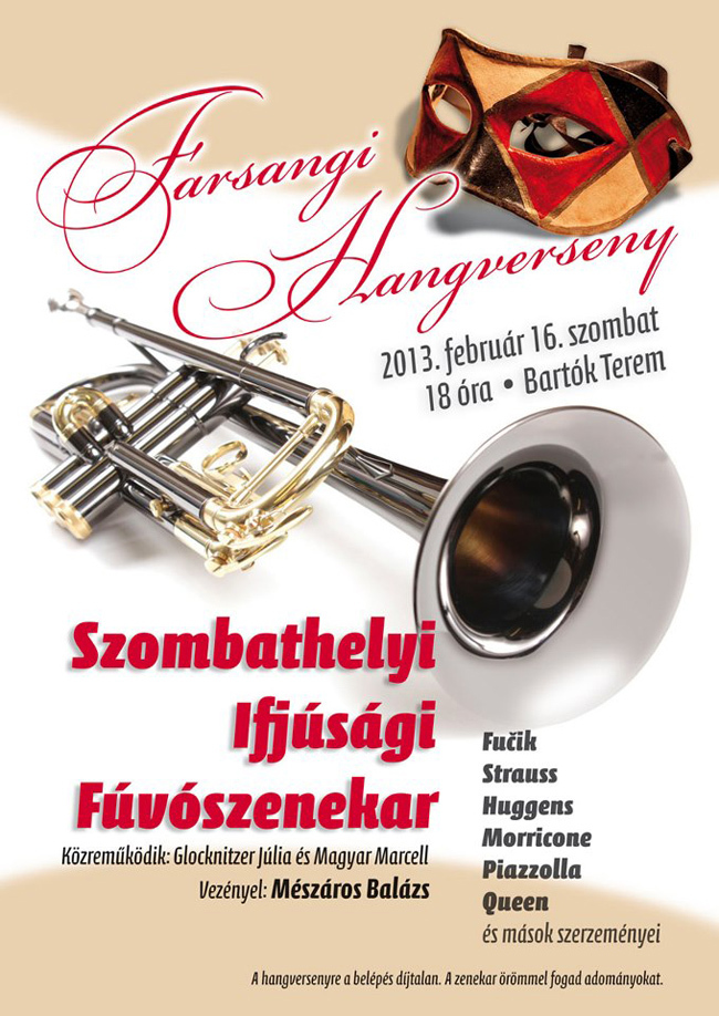 Február 16-án lesz a farsangi hangversenyünk a Bartók Teremben. Ez egy önálló koncert a részünkről, érdekessége, hogy a gyerekek a koncert második felében jelmezben játszanak. Ezen kívül lesz még koncertünk május 11-én, ez reméljük egy új sorozat része lesz. Tavaly már próbálkoztunk azzal, hogy vendéget hívunk, ekkor a Sárvári Koncertfúvószenekar fogadta el a meghívásunkat. Idén pedig folytatásként a Táplánszentkereszti Ifjúsági Fúvószenekart látjuk vendégül.