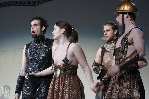 A színház fiatal színészei kiválóan átlényegülnek a darabbal, remekül jelenítik meg az örök nőt, aki éljen bár az ókorban vagy a 21. században, mégiscsak nő akar maradni, és legfőbb vágya, hogy az általa kiválasztott férfi kegyeit elnyerje. Még a lázadás idején is minden gondolatuk a férfiak felé száll, és bár tartják magukat az elhatározásukhoz, csak az után sóvárognak, hogy kedvesük karjaiba vethessék magukat. Simits Zsuzsa nagyszerűen alakítja Lüzisztraté kemény, ám mégis nőiesen vonzó szerepét, határozottan vezeti végig a lázadást, és tartja vissza a szökni készülő asszonyokat. A nőkkel szemben áll a férfiak kissé ügyefogyott hada, amit szintén nagyon jól jelenítenek meg. Az előadást táncbetétek teszik színesebbé, melyek zenéjét Horgas Ádám szerezte.