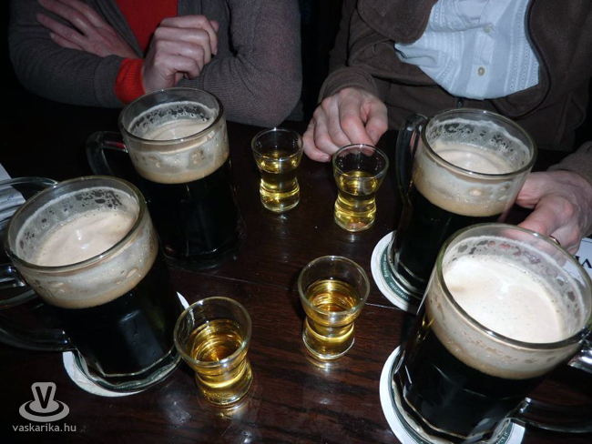Ebéd után még megnéztük a kommunizmus áldozatainak emlékművét, majd egy pihenő erejéig visszamentünk a hotelbe, hogy aztán újult erővel vághassunk neki az utolsó itteni esténknek. Ehhez igazán méltó helyet választottunk: az U Fleku-t, Prága legrégebbi sörözőjét, ahol már 1499-ben is sört mértek. Telt ház fogadott minket, az utcán és az előtérben is álltak. Merészen bementünk, és a közömbösnek ható teremfőnök 2 percen belül leültetett minket. A sarokban egy angol ült a barátnőjével (velük egyébként háromszor is összefutottunk prágai tartózkodásunk alatt), mellette egy igen jóképű középkorú olasz, de voltak oroszok, japánok és természetesen magyarok is. Máris hozták a helyben főzött, csodás hab koronázta barna sört és megérkezett a Becherovkát kínáló pincér is, aki olyan ártatlan arcot vágott, miközben felénk nyújtotta a tálcát, hogy egyszerűen nem lehetett neki ellenállni.