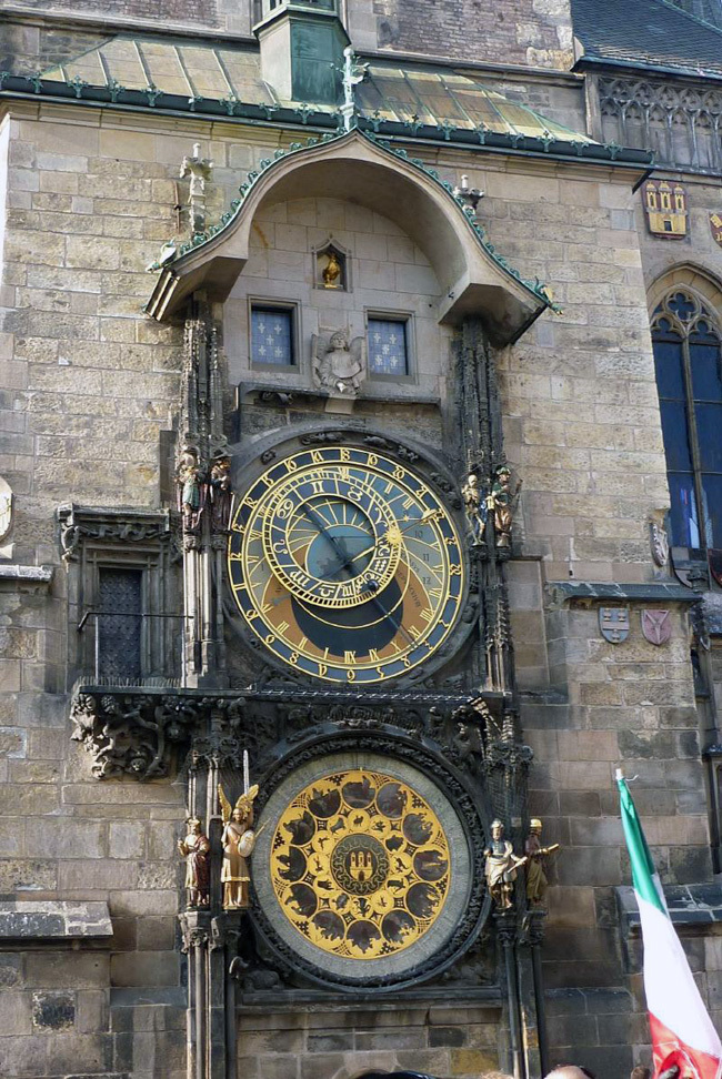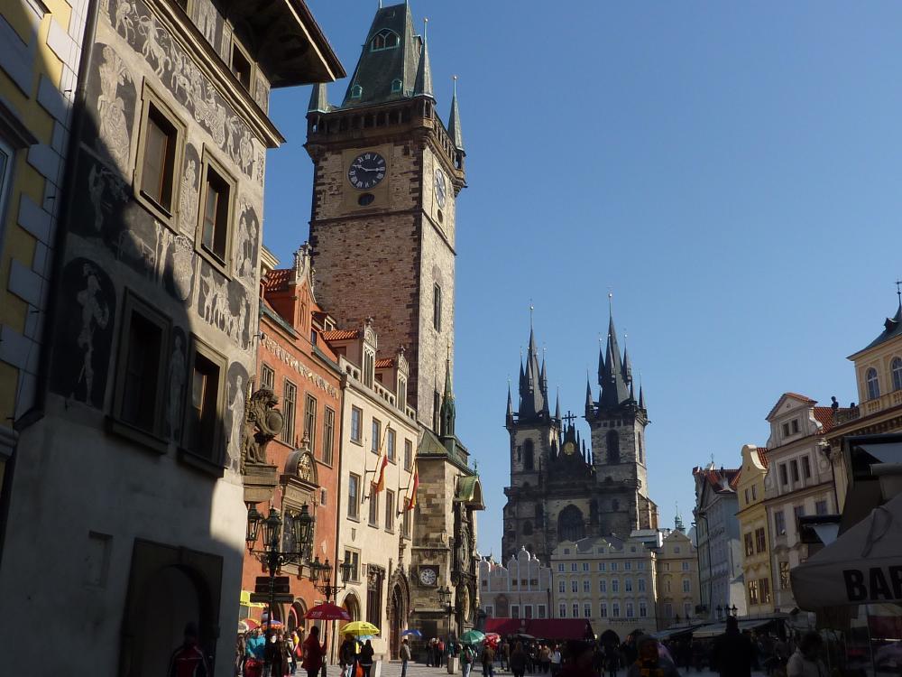 A végén jobbra fordulva a Na Prikopé bevásárló utca a Lőportoronyhoz vezetne el minket, de a mi célunk az Óvárosi tér volt, így egyenesen mentünk. Csak követnünk kellett a tömeget, és máris az Orloj, vagyis a városháza oldalán található, 1410 óta működő időmérő szerkezet előtt találtuk magunkat. Minden hatvanadik percben megtelik a tér, mert az óra a felső részében lévő ablakokban elvonulnak az apostolok.