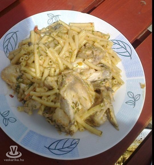Készítsünk a húsból kevés hagymával pörköltet, de ne tegyünk bele fűszerpaprikát. Amikor még kb. ½ óra van hátra a főzésből, tegyünk a pörköltbe egy csomag tésztát. Rövidcsövet szoktunk használni, de bármilyen száraz tészta jó hozzá. Öntsük fel annyi vízzel, amennyi éppen ellepi, és tegyünk bele mennyiségtől függően 2,5 - 5 dl tejszínt. Tálaláskor megszórjuk friss vágott kaporral.