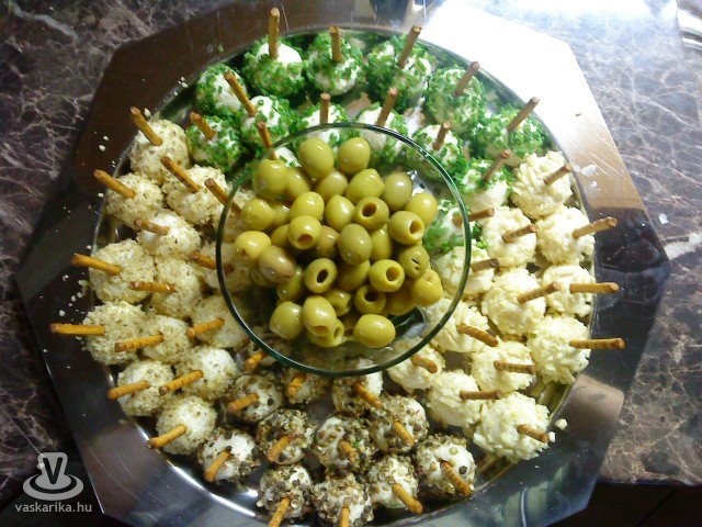 Reszeljünk le 30 dkg vegyes (füstölt, edami, trappista) sajtot. Keverjünk hozzá 5 dkg puhavajat, 2 gerezd reszelt fokhagymát, sót, valamint annyi tejfölt, hogy formázható, de kemény masszát kapjunk. Vizes kézzel kis golyókat formázunk belőle, majd megforgatjuk ízlés szerint vágott petrezselyemben, vágott kaporban, durvára darált dióban, mandulában, esetleg reszelt sárgarépában. Mindegyik golyó közepébe beleszúrunk egy fél ropit, és tálaljuk.