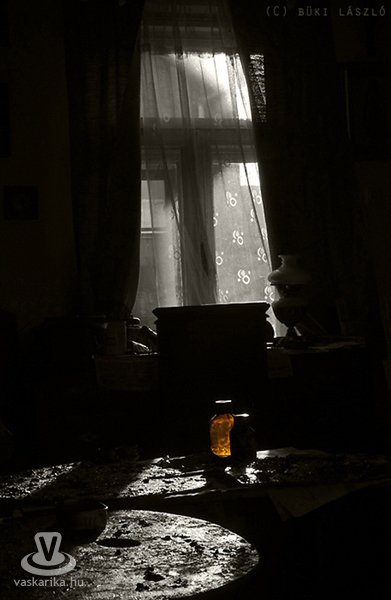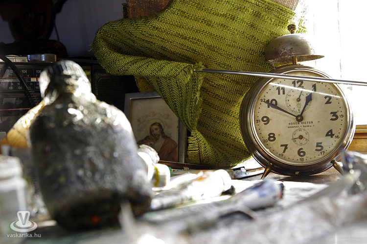 A bőröndöt, koponyát, gyertyatartót és vekkereket már csak a kulcscímerek megalázó pillantásának hátat fordítva tudom olykor-olykor szemügyre venni, miközben Valter mesél. Mesél mindarról, ami itt kézzel fogható módon van jelen, s arról, amiért a kulcscímerek joggal néznek rám úgy, ahogy. Például arról, hogy régen értéke volt a jól végzett munkának, sőt, régen igénye volt az embereknek jól végezni a munkájukat. Igényük volt a praktikumot és a szépséget együtt megtartani, suszterként akár csillagászattal is foglalkozni; a bicikliről leugorva egy nehéz, munkával teli nap után nekiállni festeni a csomagtartóra szíjazott fatáblára. Egyszerűen: volt igényük. Élni? Igen. Azt hiszem ez a legtalálóbb szó.