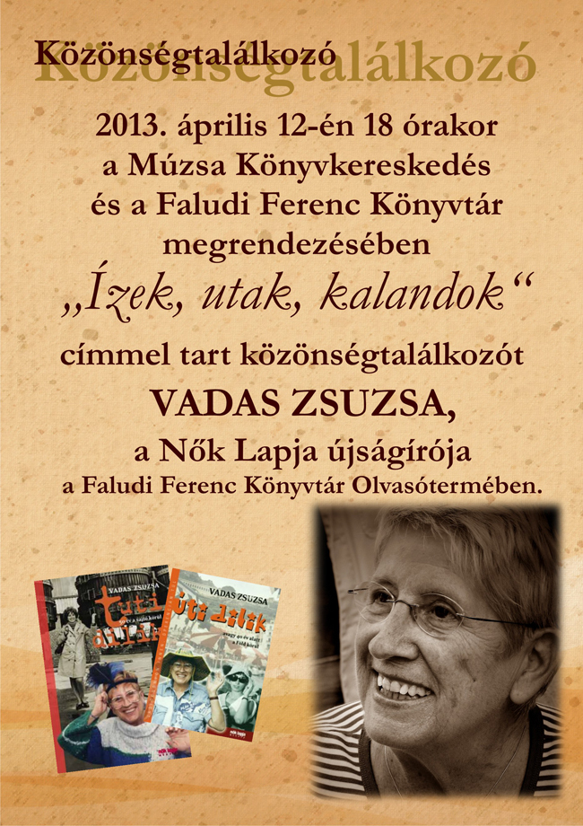 Április 12-én 18 órakor "Ízek, utak, kalandok" címmel tart közönségtalálkozót Vadas Zsuzsa, a Nők Lapja újságírója a Faludi Ferenc Könyvtár olvasótermében.