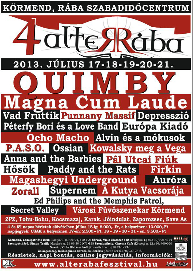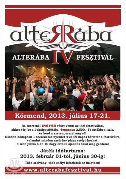 Összegyűjtöttük a 4. AlteRába Fesztivál futó játékait, akcióit és bérletvásárlási információit. Az eddigi legnagyobb költségvetéssel és legerősebb zenekari felhozatallal előrukkoló AlteRábát immár negyedik alkalommal rendezik meg Körmenden. A fesztivál időpontja: július 17-21. A helyszín: Rába Szabadidőcentrum.