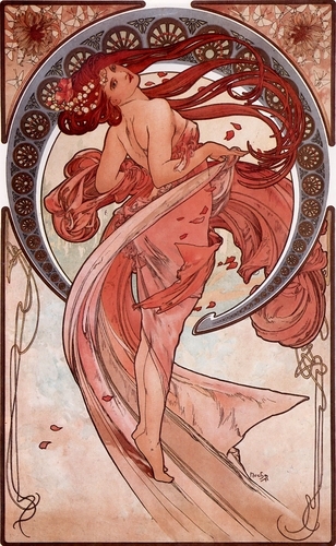 Muchát a szecesszió jeles képviselőjeként jegyzik, ennek ellenére nem vallotta magáénak az art nouveau elveit, nézeteit inkább a szimbolizmussal rokonította. Pedig elhíresült nőalakjaiban felhasználta a szecesszió egész eszköztárát - buja vonalvezetés, kígyózó indák, stilizált növényi motívumok, drágakő szépségű részletek, romantikus tisztaságot közvetítő, szabadon áramló formák jellemzik az alkotásait.
