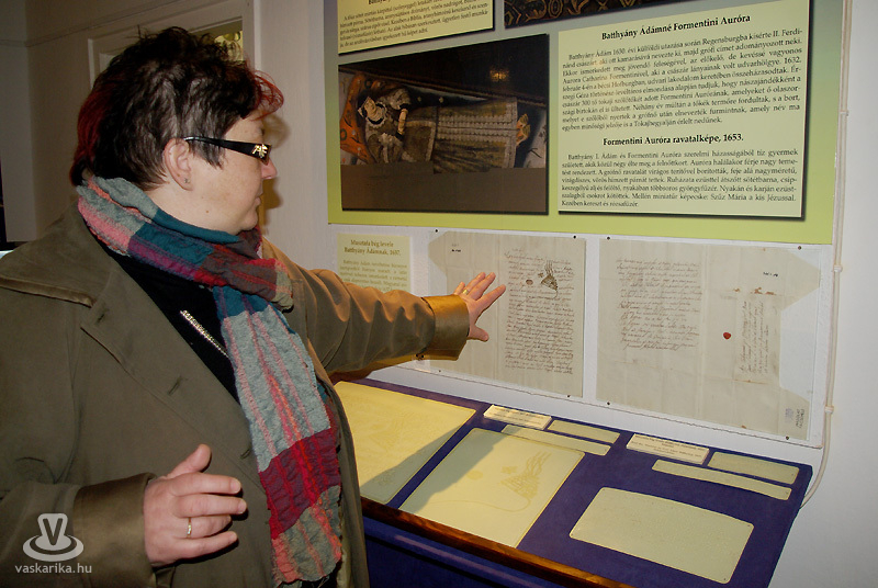 Láthatunk, tapinthatunk egy magyar nyelvű, 1637-ben kelt levelet, amit Musztafa bég írt Batthyány Ádámnak. Ez is másolat. Ez az érdekes minta Musztafa bég saját kezű aláírása, a tugrája. Egy nagyított változatát kitettük ide tapintható változatba, egyrészt, hogy érezzék, hogy milyen a tipográfiája, másrészt pedig itt a tugra érezhető szövegkörnyezetben. Mivel azonban ezt így egyben nehezebben lehetne érzékelni, ezért itt van külön is kiemelve a levél betűhív leirata mellett. Ezt pontírással is kiraktuk, de a hangzóanyagban fel is olvassuk.