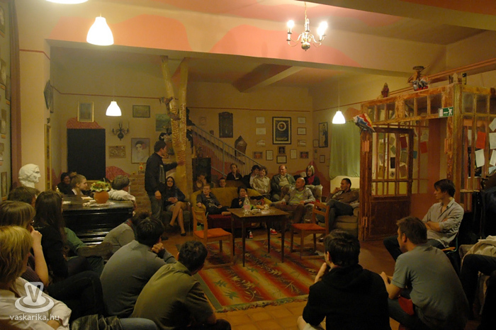 Koncentrikus körökben elrendezett fotelekkel és puffokkal szembesültem, olyan "rendben a káosz"- típusúval. A celldömölki Soltis Lajos Színház előterének közepén pedig egy asztal, rajta irdatlan mennyiségű szotyi. Akkor már sejtettem, hogy nem a társulat hagyta ott délutáni beszélgetése után. Aztán egy gyors ültetési rend (nem mindegy, hova teszi le a néző a popsiját) és jöhetett az agyalás: most akkor ki beépített ember, és ki szimplán csak néző? Már most leszögezem, a végére sem vált olyan egyértelművé, de tetszett a helyzet, végre nem a színpadon van a színház, hanem két centire az orrom előtt. Körbejátszottak mindenkit: egy elképzelt lakásban, három telefonnal, furulyával és egy medvesajttal (mert ez lett a darab alfája és omegája). Szeretem én az improvizatívnak feltüntetett több szálon futó zűrzavarokat. A HOPPart Szörprájzpartija nekem olyan volt, mint Bach Drum and Bass-el keverve, tömény mogyoróvaj habzsolás kiskanállal, és az emberek reakciója, mikor piros cipőhöz kék zoknit húzok. Először furcsa, aztán már nem az, végül megszokod, megszereted, és újra meg újra akarod.