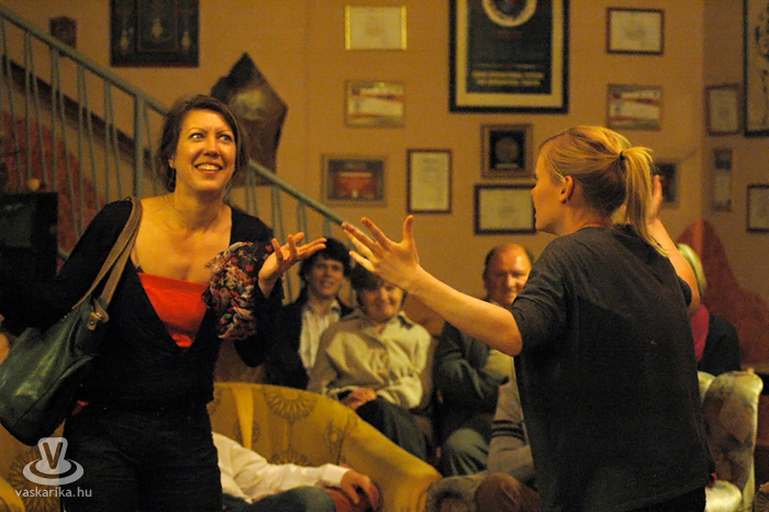 Kiss Diána Magdolna Chaplin-pólójáért licitálni szeretnék, ahogy az énekhangjáért is. Szemben vele Szilágyi Katalin gyors, pezsgő és impulzív rezgésként csapódott az ellenfele irányába. Verbálisan és karate mozgással egyaránt. A vergődő és önelemző női szerepeket még Jane Austen is megirigyelte volna. Jó, hogy Gloria Gaynor megénekelte, hogy mindent túl lehet élni (I will survive című dallal készültek közösen Zsoltinak). Ennyit a ruhapárbajig fajult feminizmusról vagy a zombitáncról, mert mindkettőből kaptunk egy keveset. Ó, és ki ne hagyjam az este meghatározó momentumát (többszörös pillanatképek voltak ezek, a feldolgozásuk viszont több időt vett igénybe): Herczeg Tamás orrfurulya játéka -na meg gitárpengetése- vizuális fejbevágással pecsételte meg a darabot.